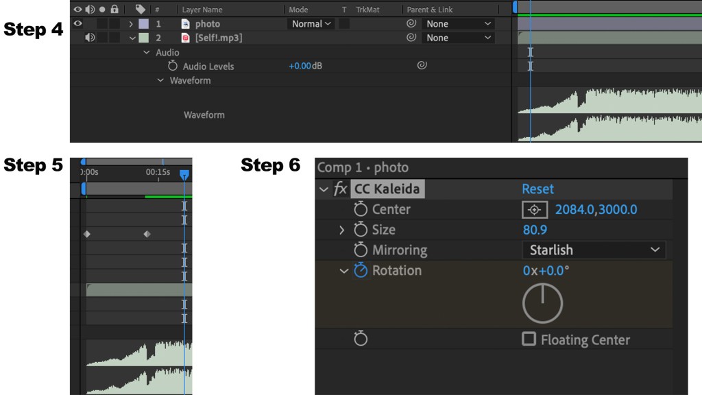 Step 6: Continue to automate different effects at different points in the song, using the waveform as the guides to align the keyframes. Keyframes will change at the point your marker is at when you change the parameter on the effect. I am mostly changing the Kaleidoscope rotation parameter. Holding shift will align your selection to the marker when setting points.